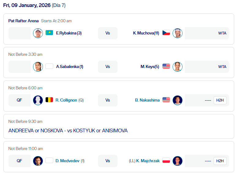 La actividad seguirá este jueves con la definición de los últimos cuatro boletos a cuartos de final. En la jornada se medirán Rinky Hijikata ante Giovanni Mpetshi Perricard, Raphael Collignon en frente de Grigor Dimitrov, Cameron Norrie contra Aleksandar Kovacevic y Quentin Halys frente Brandon Nakashima, en un cuadro que asegura proseguir subiendo el nivel competitivo en Brisbane.
